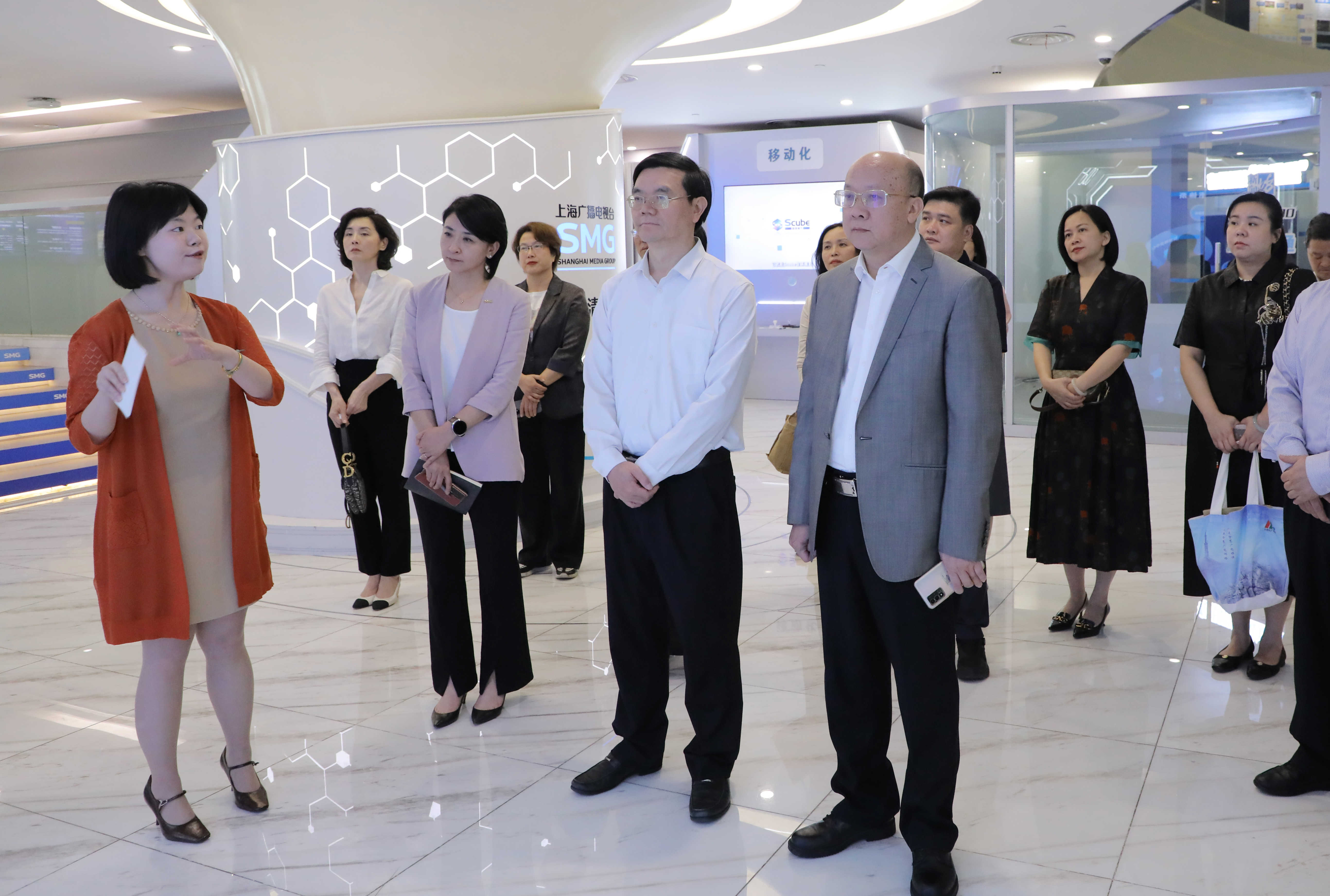 考察组一行先后实地参观了上海广播电视台(上海文广集团)新媒体平台、智慧广电展示区,观看智慧媒体数字底座、AIGC 工具箱“Scube 智媒魔方”、超高清内容演示,详细了解上海广播电视台(上海文广集团)四个主要新媒体产品运营和智慧广电技术体系“智能化、超清化、移动化”建设情况。